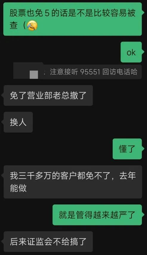 因为博主贴出的图中还有股票免 5 的券商,我就问他们,银河的股票免 5 是不是很容易被查。他说查到了营业部撤了,老总换人。虽然我觉得多少有夸张吧,但应该性质差不多。