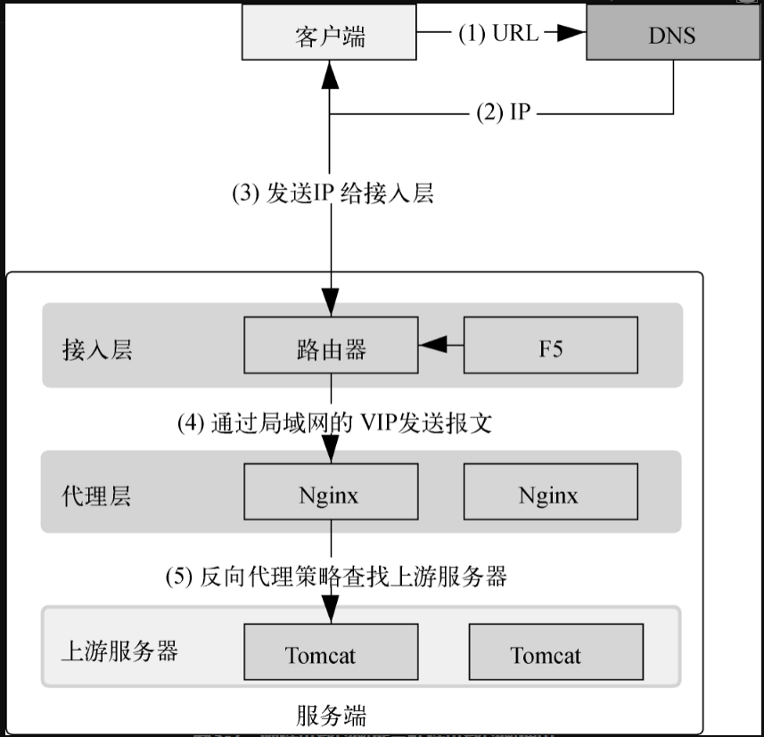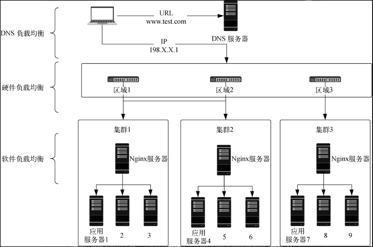 DNS(Domain Name System,域名系统)是互联网的一项服务。它将域名和 IP 地址的相互映射保存在一个分布式数据库中,使人们能够更方便地访问互联网。DNS 服务器用来实现区域级别的负载均衡。例如使华北用户访问华北机房的服务器、使华中用户访问华中机房的服务器,本质是通过 DNS 服务器再解析 URL 以后,返回对应机房的入口 IP 地址。