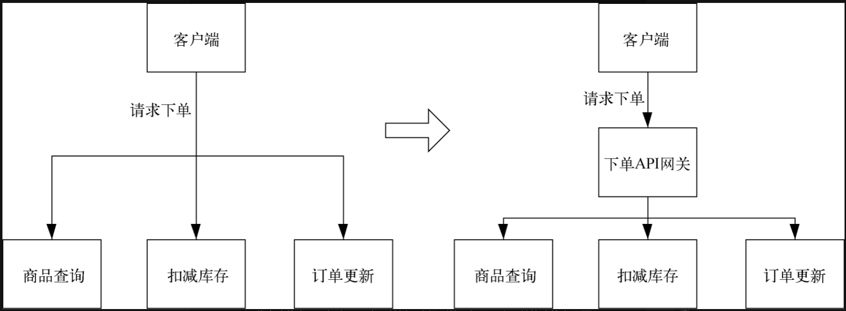 从业务层面讲,客户端完成某个业务需要同时调用多个微服务。如果这些服务需要客户端分别调用才能完成,必然会增加请求的复杂度,同时带来网络调用性能的损耗。因此,针对微服务应用场景推出了 API 网关的调用。在客户端与微服务系统之间加入下单 API 网关,客户端直接给这个 API 网关下达命令,由其完成对其他三个微服务的调用并且返回结果给客户端。