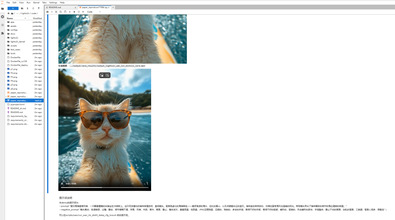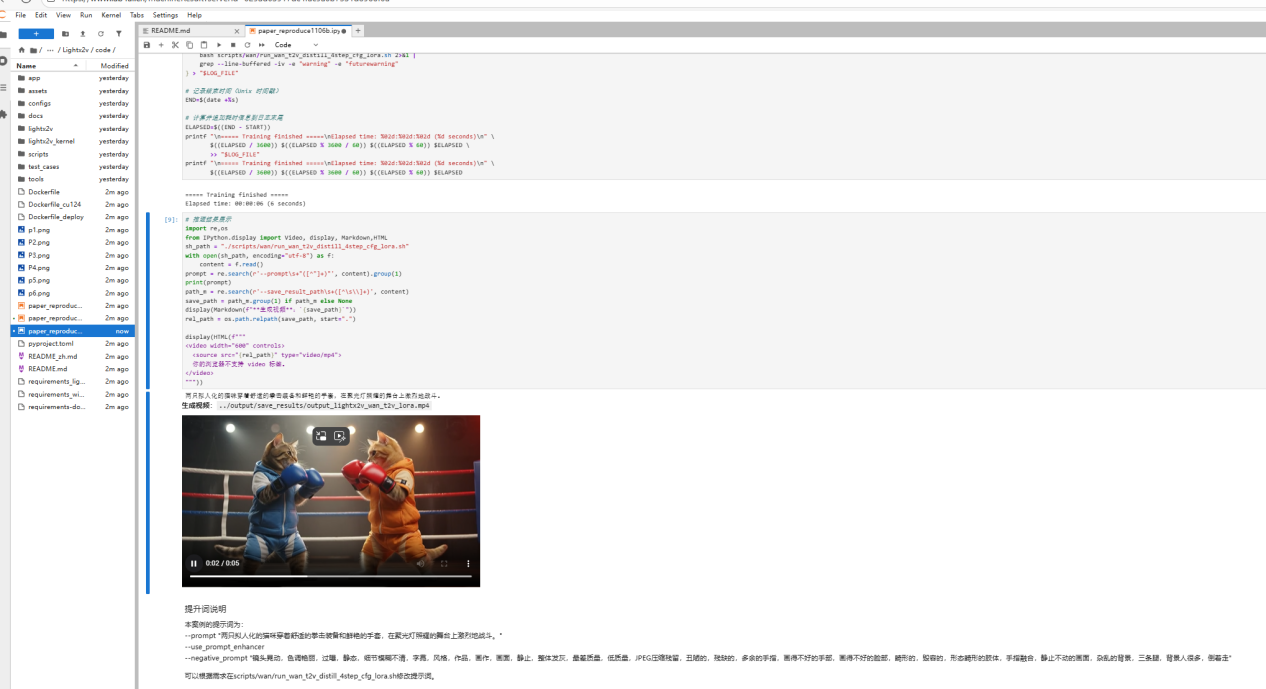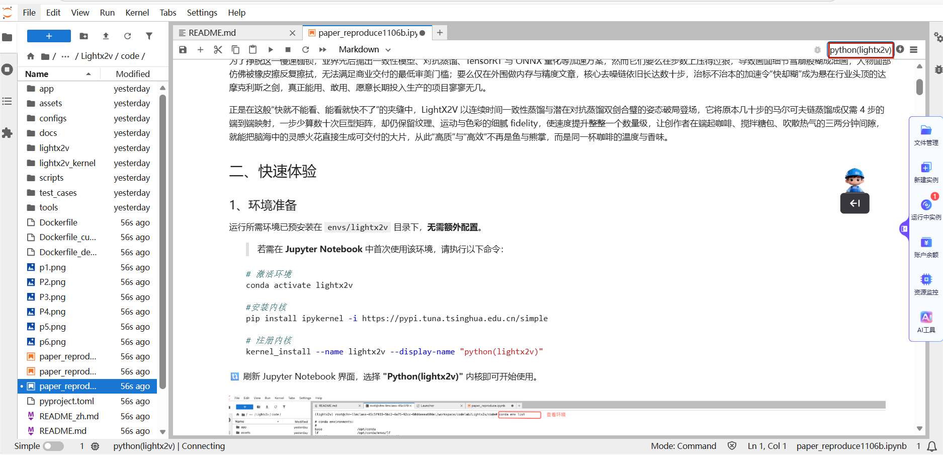 参考文档准备好环境后,在 Notebook 中选择内核:Python(lightx2v),即可进行快速体验