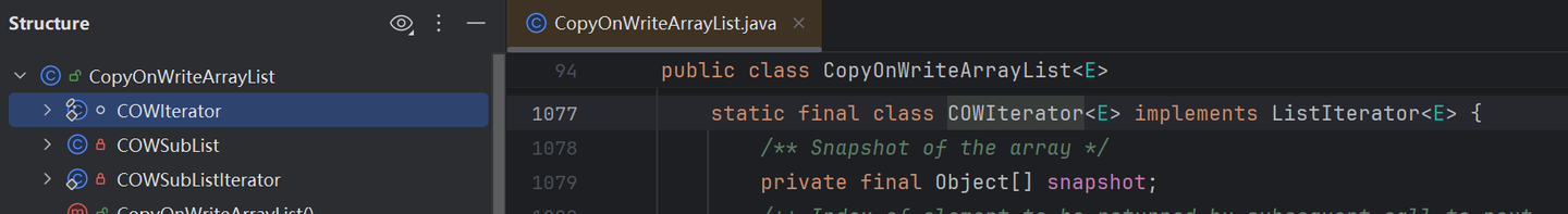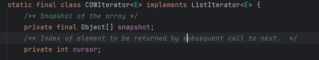 COWIterator是一个自定义的迭代器, 通过持有原数组的快照(snapshot)和游标(cursor)来实现迭代,保证迭代过程不受后续修改影响。