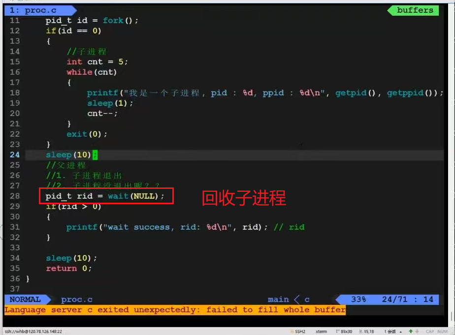 • 如果传递NULL,表⽰不关⼼⼦进程的退出状态信息。