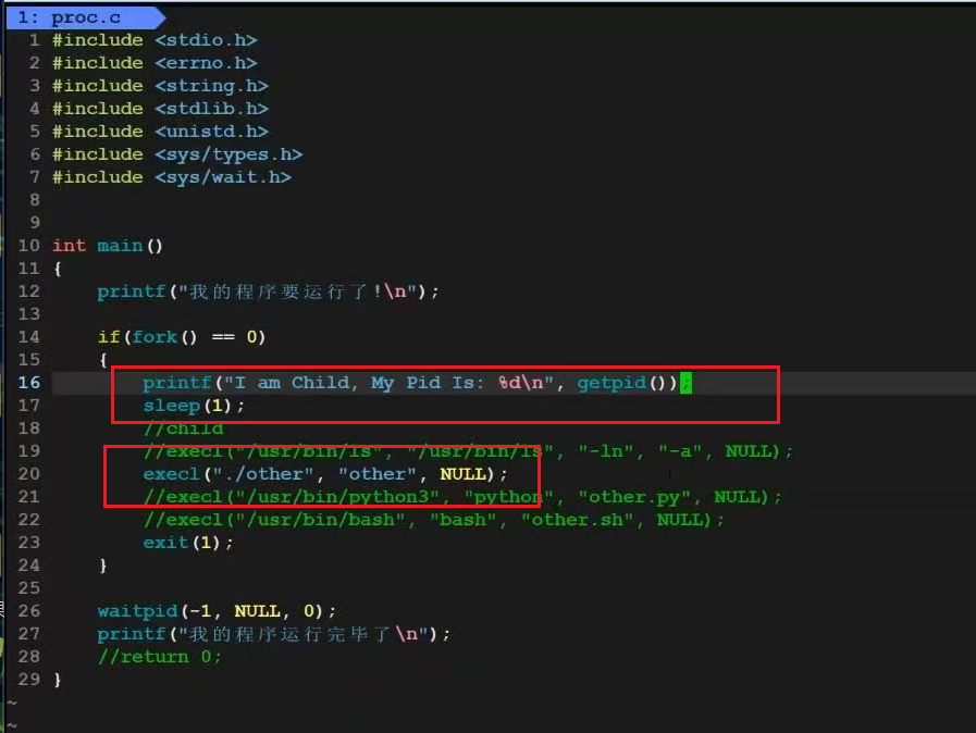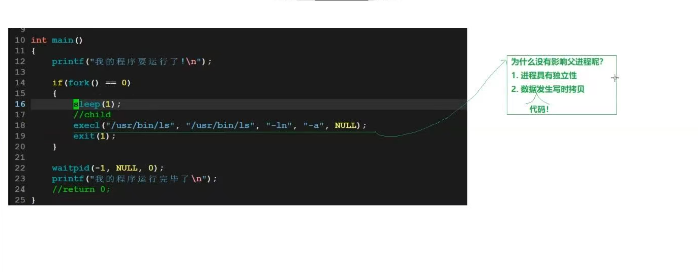 1.一旦程序替换成功,就去执行新代码了,原始代码的后半部分(也就是exec的后面部分),已经不存在了。