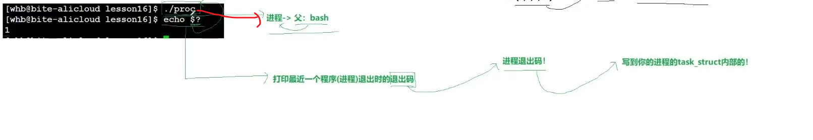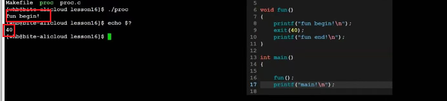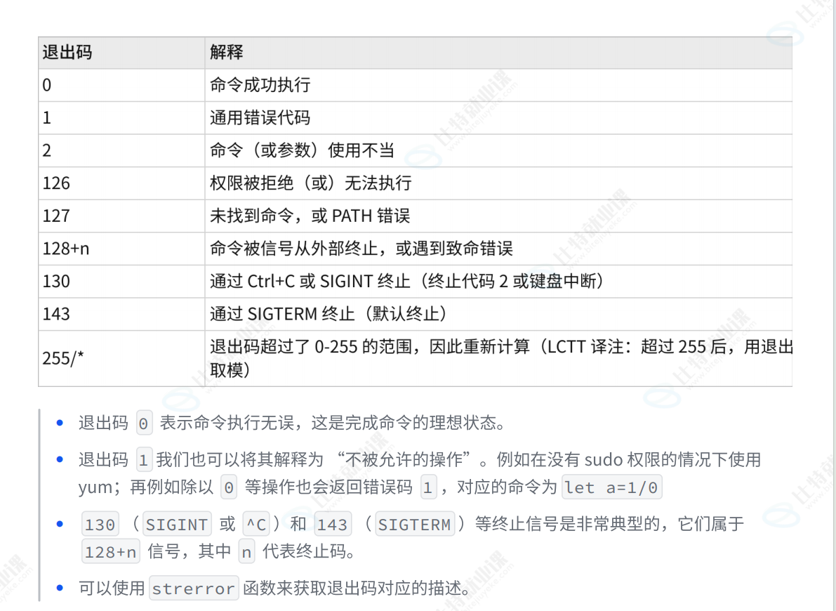 任何地方调用exit,表示代码(进程)结束。并返回给父进程bash,子进程的退出码
