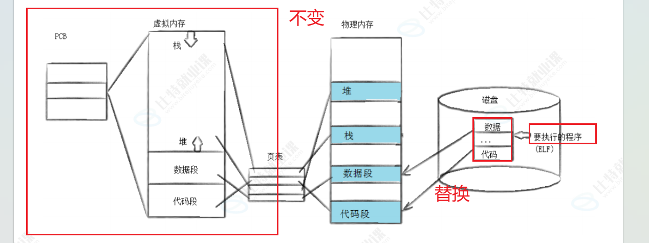 应用替换是通过特定的接⼝,加载磁盘上的⼀个全新的代码(代码和数据),加载到调⽤进程的地址空间中