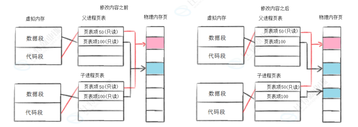 通常,⽗⼦代码共享,⽗⼦再不写⼊时,数据也是共享的,当任意⼀⽅试图写⼊,便以写时拷⻉的⽅式各⾃⼀份副本。具体⻅下图: