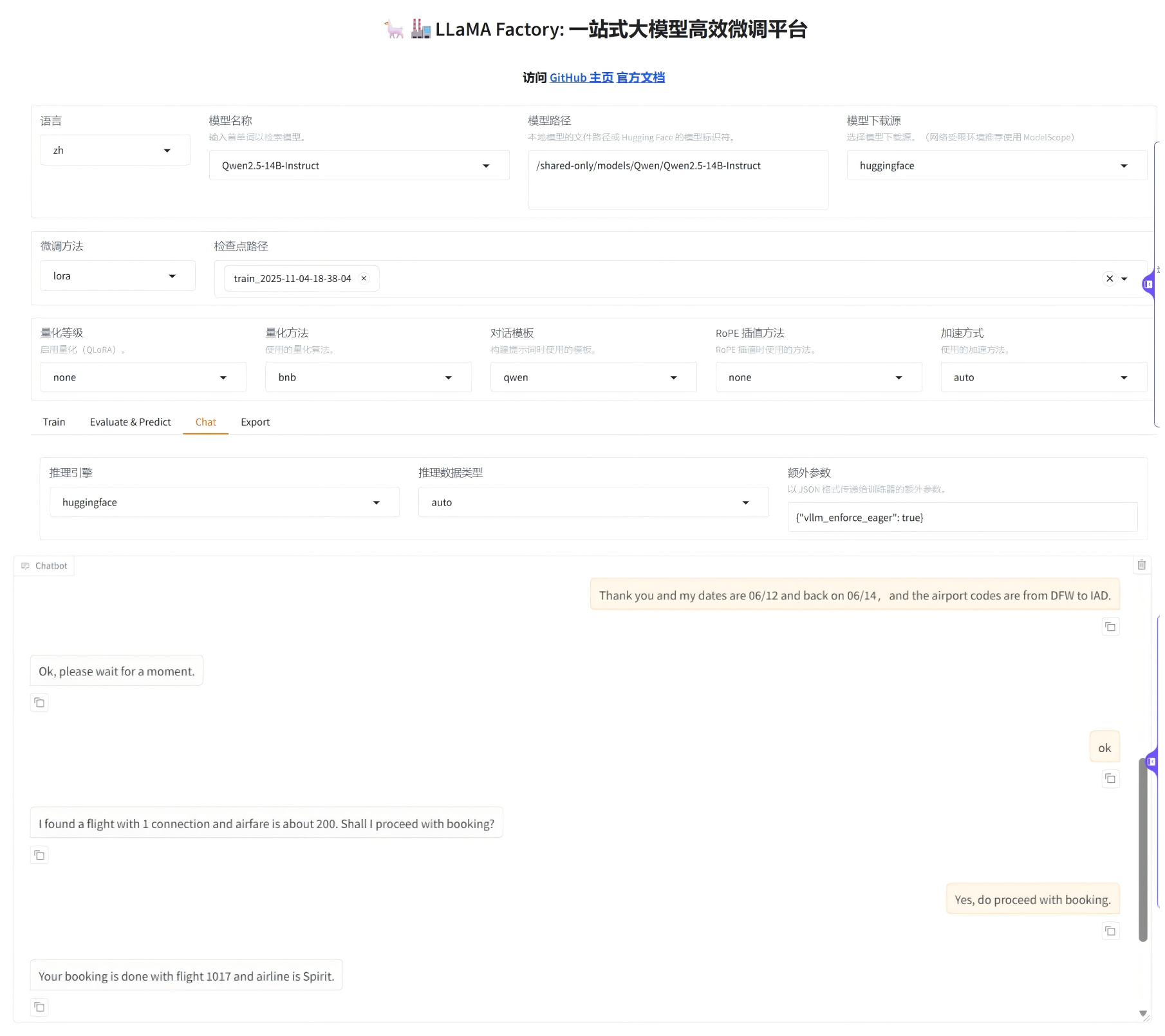 在此项目中LLaMA-Factory提供了更灵活、更高效的框架,让训练过程更加可控、可视化,也为未来的多模态拓展(语音、图像等)奠定了基础。简单三步,就能让 AI 从“门外汉”变身为“专业票务客服”,你也快来试试吧!