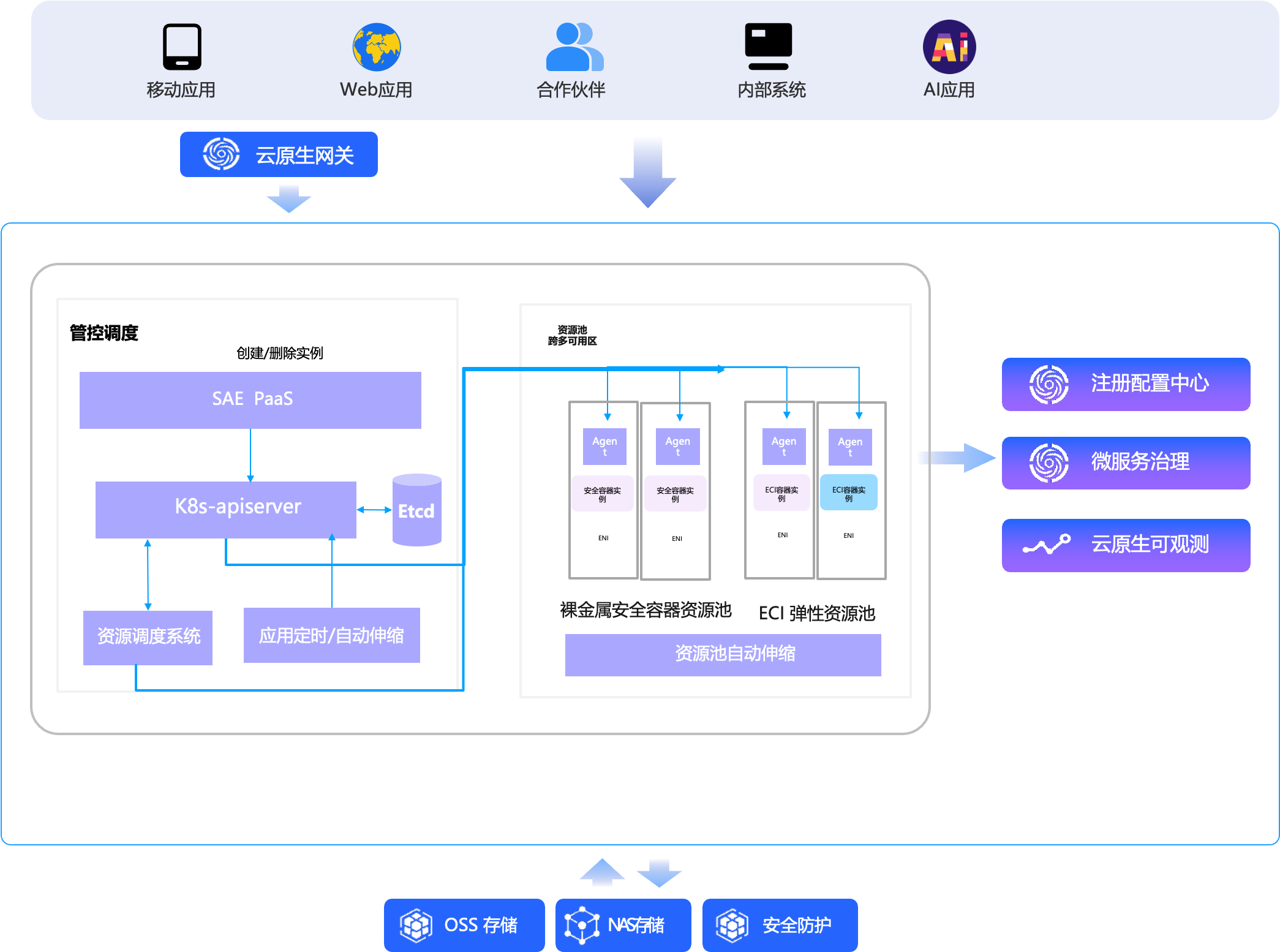 SAE 背后打通神龙裸金属服务器、弹性容器实例(ECI)支持各代 x86/ARM等海量资源,形成统一调度池。 - 智能跨机型调度: