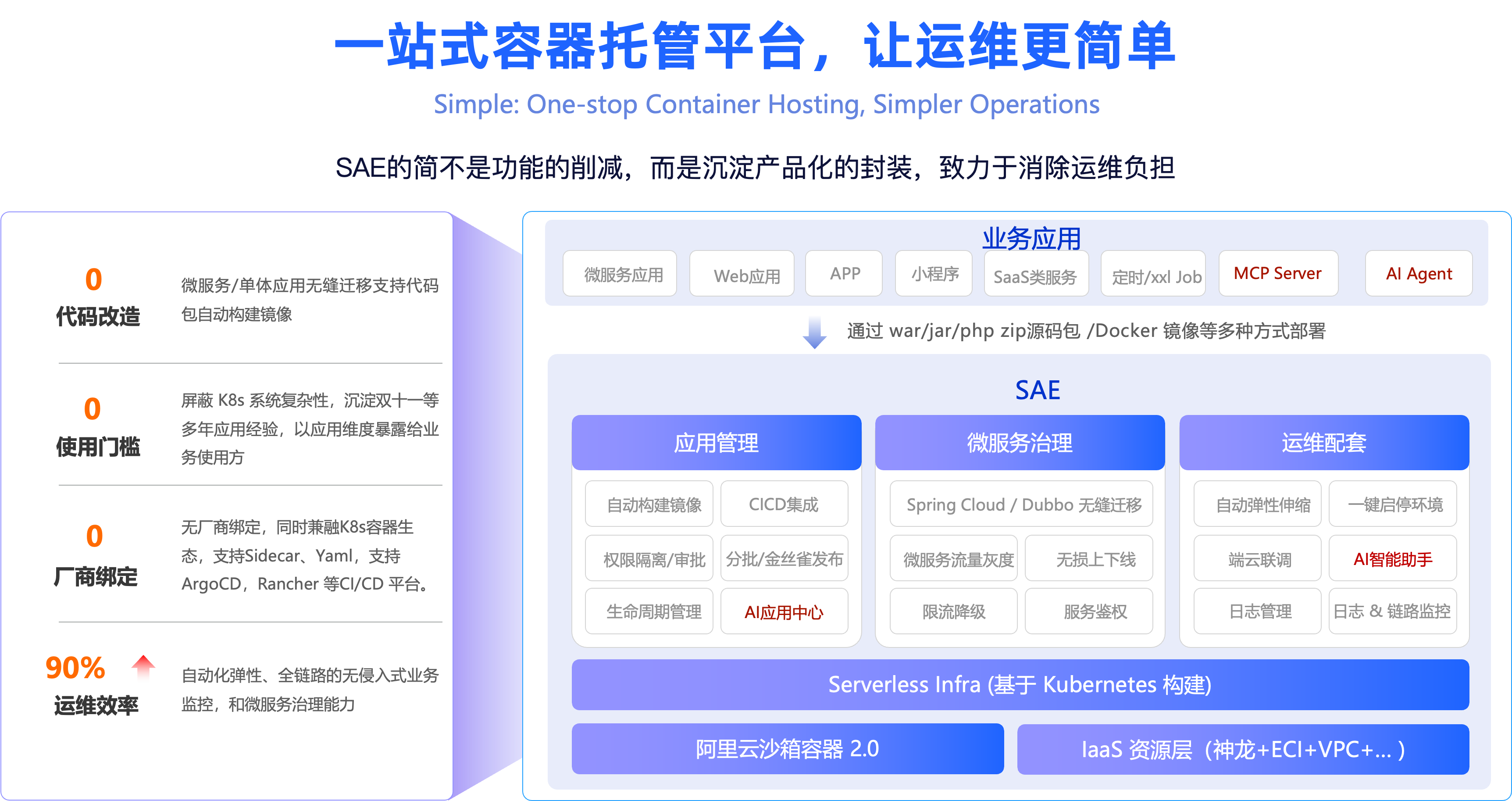阿里云 Serverless 应用引擎 SAE 是面向 AI 时代的一站式容器化应用托管平台,以“托底传统应用、加速 AI 创新”为核心理念。它简化运维、保障稳定、闲置特性降低 75% 成本,并通过 AI 智能助手提升运维效率。