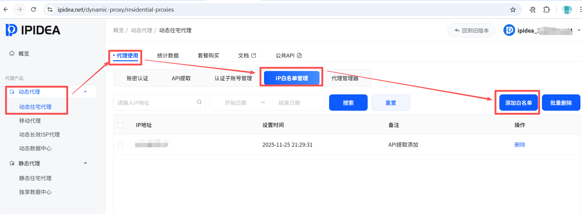 如上图所示,账号注册成功之后,点击右上角用户名,进入概览页。然后依次找到动态代理->动态住宅代理->代理使用->IP白名单管理->添加白名单,然后输入自己当前的IP地址和备注信息,点击确认按钮即可。
