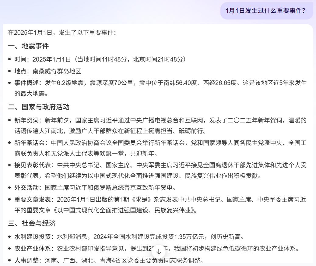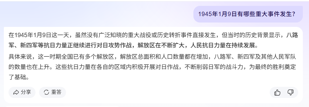 根据对第一个问题的回答进行对比分析后发现,引入知识库显著提升了AI系统的知识容量。从第二个问题的回答对比中可以看出,在知识库的支持下,AI的回答更加贴合“历史大事记”智能体的特定调性,其重点集中于历史事件而非近期发生的事件上,从而更接近预期设定的标准。