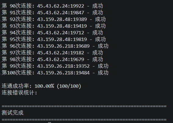 def test_proxy_connectivity(IP: str, port: int) -> Tuple[bool, float, Optional[str]]:"""测试代理连通性"""start_time = time.time()try:# 测试TCP连接sock = socket.socket(socket.AF_INET, socket.SOCK_STREAM)sock.settimeout(10)sock.connect((IP, port))connect_time = time.time() - start_timesock.close()return True, connect_time, Noneexcept Exception as e:connect_time = time.time() - start_timeerror_msg = f"连接失败: {str(e)}"return False, connect_time, error_msgdef test_3_connection_success_rate():"""测试3: 代理IP连通成功率"""print("\n" + "=" * 60)print("测试3: 代理IP连通成功率 (测试100次)")print("=" * 60)successful_connections = 0failed_connections = 0connection_errors = {}for i in range(100):proxy_data, _, extract_error = extract_proxy()if proxy_data and extract_error is None:IP= proxy_data["data"][0]["IP"]port = proxy_data["data"][0]["port"]success, _, conn_error = test_proxy_connectivity(IP, port)if success:successful_connections += 1print(f"第{i+1:3d}次连接: {IP}:{port} - 成功")else:failed_connections += 1connection_errors[conn_error] = connection_errors.get(conn_error, 0) + 1print(f"第{i+1:3d}次连接: {IP}:{port} - 失败 ({conn_error})")else:failed_connections += 1error_msg = f"提取失败: {extract_error}"connection_errors[error_msg] = connection_errors.get(error_msg, 0) + 1print(f"第{i+1:3d}次连接: 提取失败 - {extract_error}")success_rate = (successful_connections / 100) * 100print(f"\n连通成功率: {success_rate:.2f}% ({successful_connections}/100)")print("连接错误统计:")for error, count in connection_errors.items():print(f" {error}: {count}次")return success_rate, connection_errors