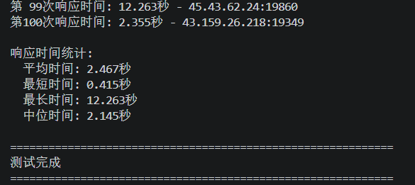 def test_proxy_response_time(IP: str, port: int) -> Tuple[Optional[float], float]:"""测试代理响应时间"""start_time = time.time()proxy = f"http://{IP}:{port}"proxies = {"http": proxy, "https": proxy}test_url = "http://www.baidu.com"try:response = requests.get(test_url, proxies=proxies, timeout=15)if response.status_code == 200:response_time = time.time() - start_timereturn response_time, response_timeexcept Exception as e:passtotal_time = time.time() - start_timereturn None, total_timedef test_5_response_time():"""测试5: 代理IP响应时间"""print("\n" + "=" * 60)print("测试5: 代理IP响应时间 (测试100次)")print("=" * 60)response_times = []for i in range(100):proxy_data, _, extract_error = extract_proxy()if proxy_data and extract_error is None:IP= proxy_data["data"][0]["IP"]port = proxy_data["data"][0]["port"]resp_time, _ = test_proxy_response_time(IP, port)if resp_time is not None:response_times.append(resp_time)print(f"第{i+1:3d}次响应时间: {resp_time:.3f}秒 - {IP}:{port}")else:print(f"第{i+1:3d}次响应时间: 测试失败 - {IP}:{port}")else:print(f"第{i+1:3d}次: 提取失败,无法测试响应时间")if response_times:avg_time = statistics.mean(response_times)min_time = min(response_times)max_time = max(response_times)median_time = statistics.median(response_times)print(f"\n响应时间统计:")print(f" 平均时间: {avg_time:.3f}秒")print(f" 最短时间: {min_time:.3f}秒")print(f" 最长时间: {max_time:.3f}秒")print(f" 中位时间: {median_time:.3f}秒")else:print("\n没有成功的响应时间测试,无法计算响应时间统计")return response_times