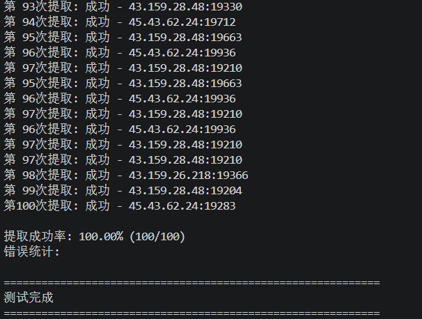 def test_1_extraction_success_rate():"""测试1: 代理IP提取成功率"""print("=" * 60)print("测试1: 代理IP提取成功率 (测试100次)")print("=" * 60)successful_extractions = 0failed_extractions = 0errors = {}for i in range(100):proxy_data, _, error = extract_proxy()if proxy_data and error is None:successful_extractions += 1print(f"第{i+1:3d}次提取: 成功 - {proxy_data['data'][0]['IP']}:{proxy_data['data'][0]['port']}")else:failed_extractions += 1errors[error] = errors.get(error, 0) + 1print(f"第{i+1:3d}次提取: 失败 - {error}")time.sleep(1)success_rate = (successful_extractions / 100) * 100print(f"\n提取成功率: {success_rate:.2f}% ({successful_extractions}/100)")print("错误统计:")for error, count in errors.items():print(f" {error}: {count}次")return success_rate, errors