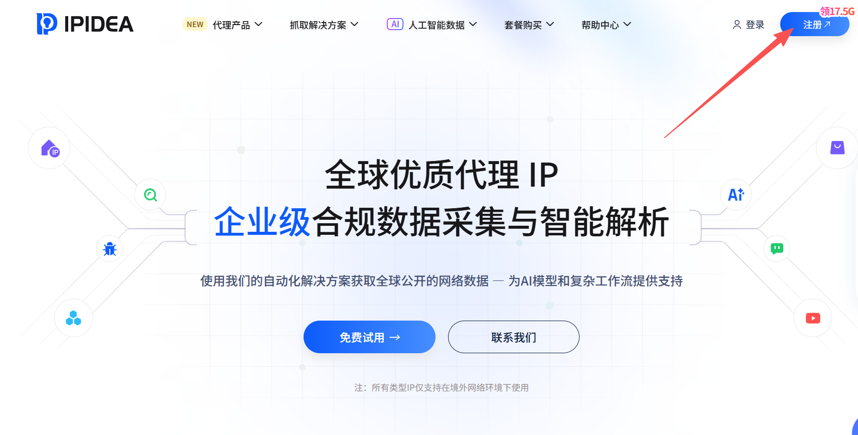 首先访问IPIDEA官网,点击右上角注册按钮,完成注册登录。