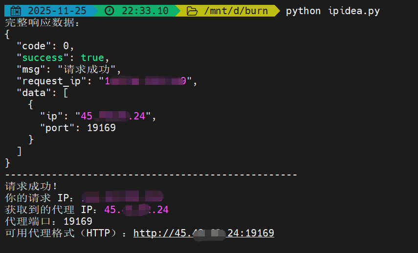 接下来,我们写一段python代码,来验证API的有效性,确保我们能够顺利提取到代理IP,同时验证我们的白名单IP配置是否生效: