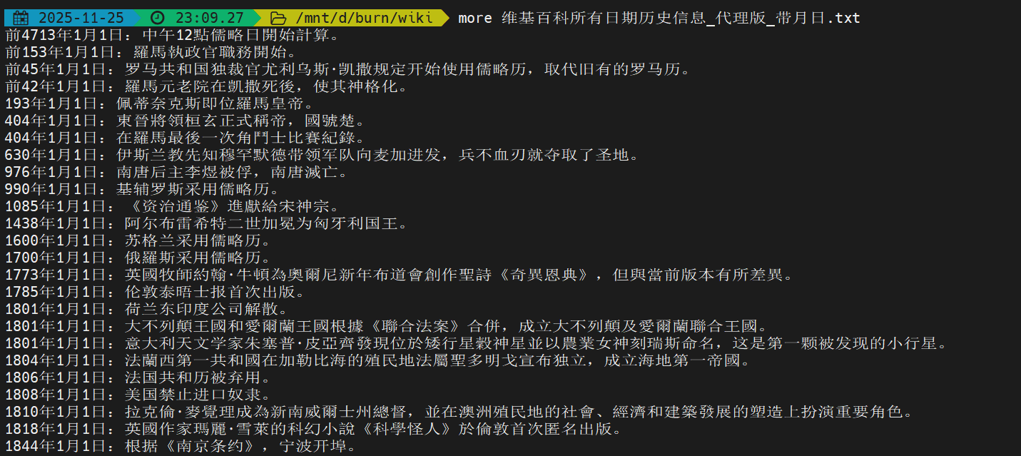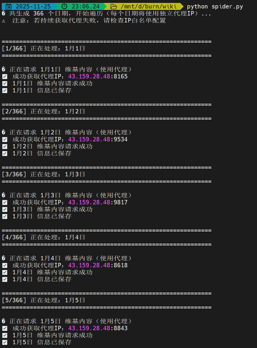 爬取每个日期的事件前,先提取一个代理IP。然后使用代理IP去抓取,抓取到内容后进行内容清洗,保存到文件:维基百科所有日期历史信息_代理版_带月日.txt中,依次循环,直到抓取完365/366个日期的所有事件。