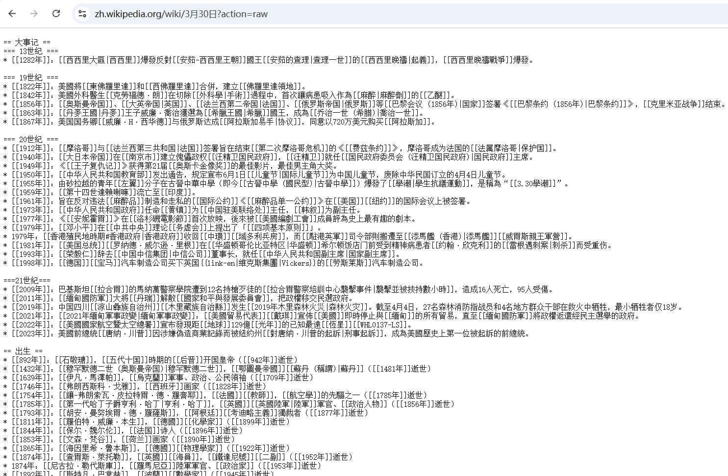 为了简化爬虫代码,提高效率,我们直接访问维基百科的纯文本页面。在任意维基百科页面URL后加?action=raw,即可跳转纯文本版本。比如:[<font style="color:rgb(0, 0, 0);">https://zh.wikipedia.org/wiki/3%E6%9C%8830%E6%97%A5?action=raw</font>](https://zh.wikipedia.org/wiki/3%E6%9C%8830%E6%97%A5?action=raw):