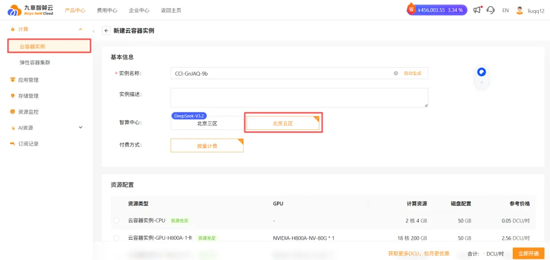 3、点击云容器实例-> 选择五区