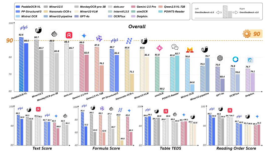 紧凑而强大的视觉语言模型架构:我们提出了一种新型视觉语言模型,该模型专为资源高效推理而设计,在元素识别方面表现出色。通过将 NaViT 风格的动态高分辨率视觉编码器与轻量级的 ERNIE-4.5-0.3B 语言模型相集成,我们显著提升了模型的识别能力和解码效率。这种集成在保持高精度的同时降低了计算需求,使其非常适合高效实用的文档处理应用。