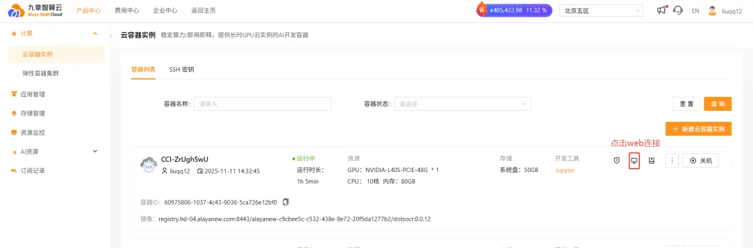 6、开通后点击云容器实例 -> 点击web连接的图标