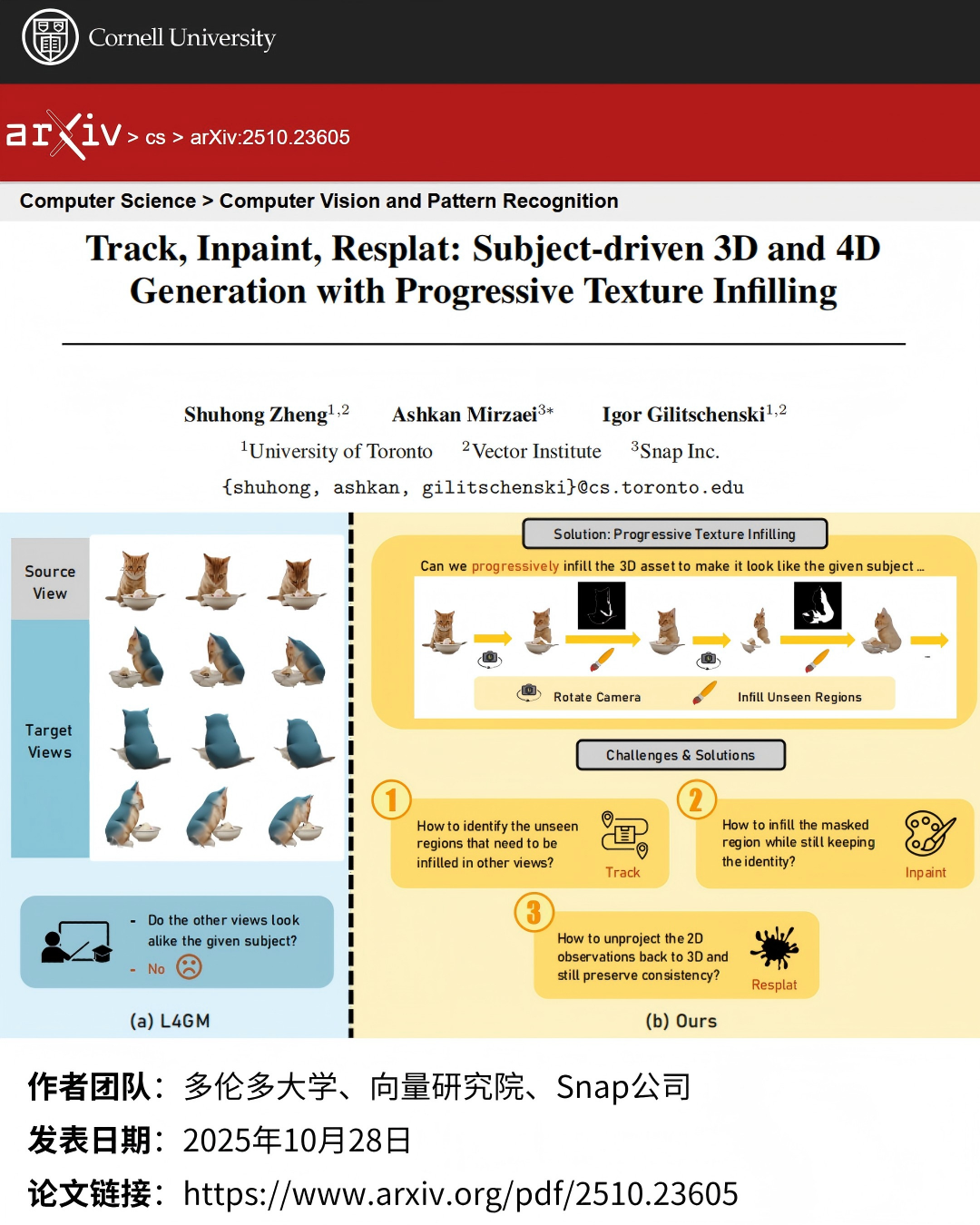 论文标题:Track, Inpaint, Resplat: Subject-driven 3D and 4D Generation with Progressive Texture Infilling