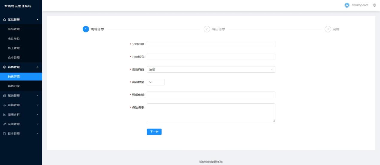 销售管理包括销售的开票和销售的记录信息,销售记录包括公司名称、打款账号、商品名称、商品数量、商品总计和开票时间。