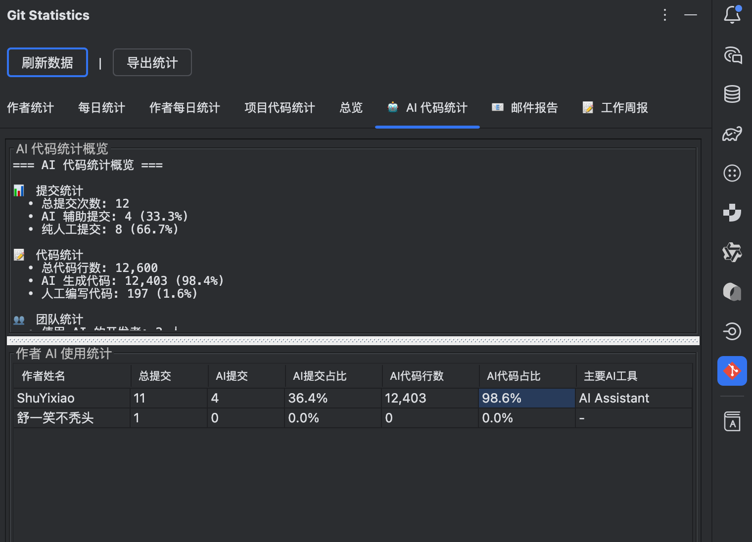 - 打开:IDE 右侧工具栏点击 “Git Statistics”