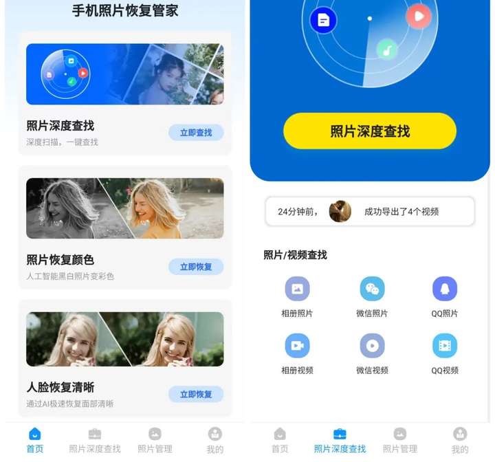打开软件,点击首页,再选择“照片深度查找”功能,软件便会自动进行扫描。手机照片恢复管家的扫描速度真的很快,一般情况下,一分钟左右就能完成扫描