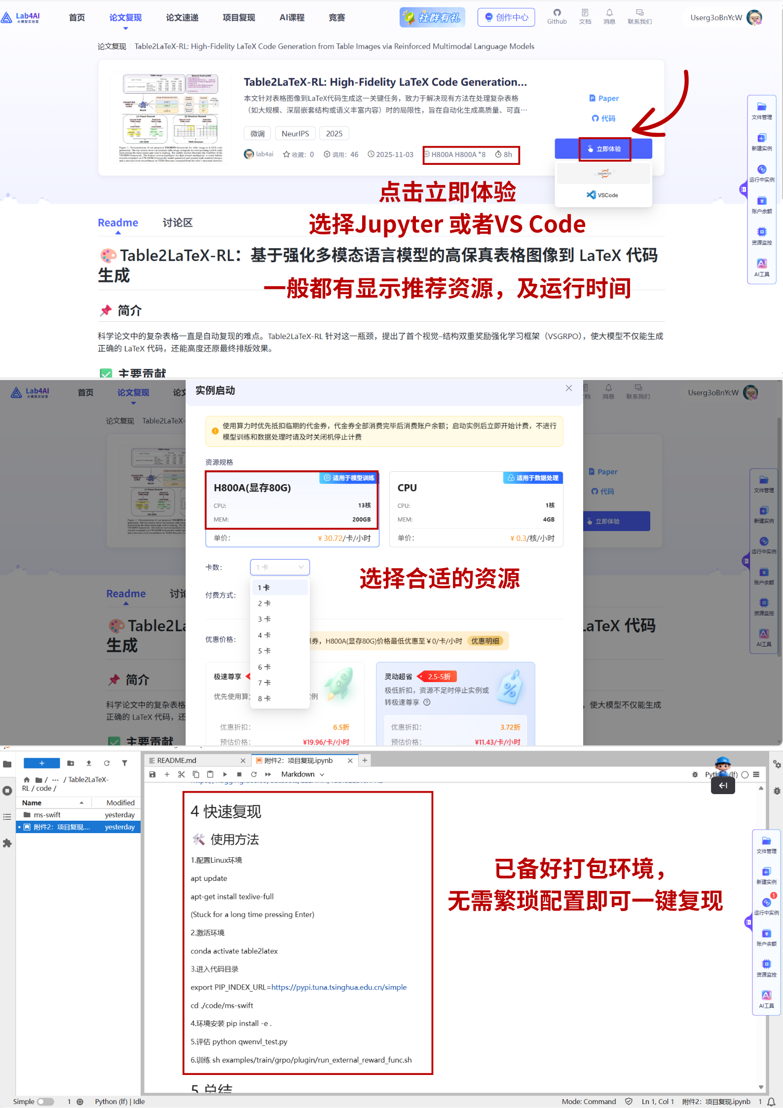 如果不想自己配环境,可以试试Lab4AI.cn,上面已经准备好了环境、代码、数据集和模型,一键就可以跑通,最新最热的顶会论文,经典的论文都有复现案例。