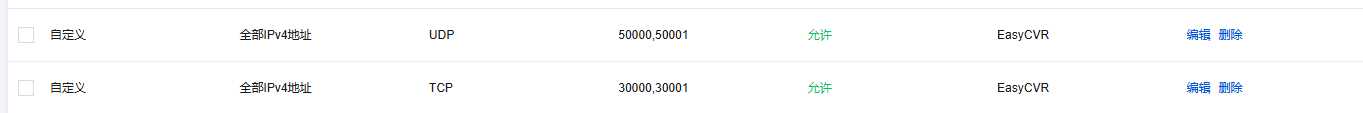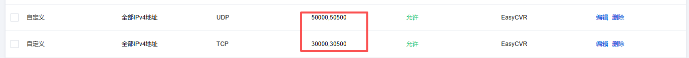 4)在用户提供防火墙策略信息后,发现端口开放范围与系统要求不符。原策略中仅开放了30000、30001、50000和50001四个单独端口,而EasyCVR实际需要使用端口范围段30000–30500和50000–50500。