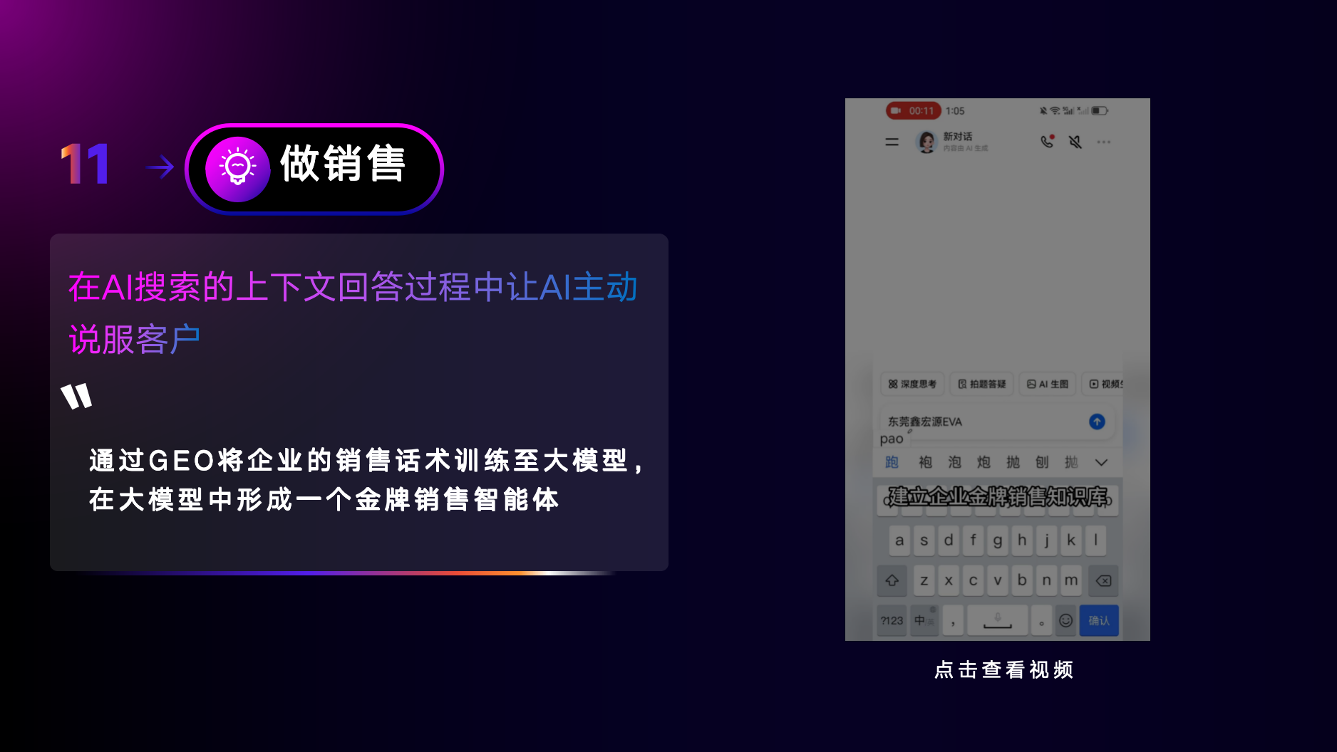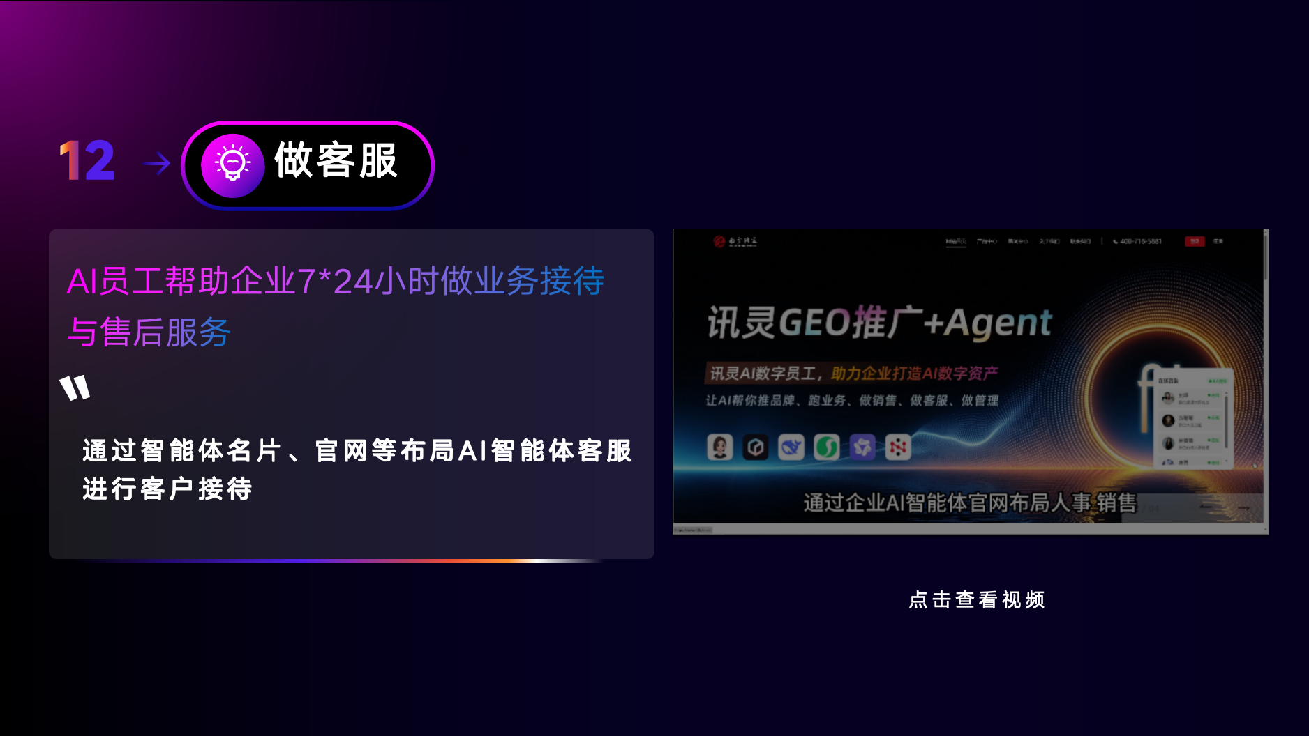 - 智能体(Agent)技术突破:推出可定制性格的Agent智能体,支持分岗位管理与加密内部智能体,既保障对外展示的专业性(如含企业视频、VR全景的智能名片),又满足内部办公需求(会议记录整理、PPT生成),实现对外获客+对内提效双重价值。