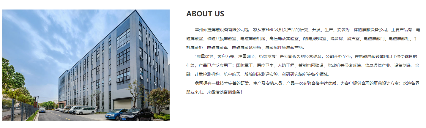 常州硕捷屏蔽设备有限公司成立于2021年,现有员工100人,专注电磁屏蔽领域,产品涵盖电磁屏蔽室、核磁共振屏蔽室、电磁屏蔽机房、高压局放实验室、微波暗室、隔音房、消声室、电磁屏蔽门、屏蔽柜、屏蔽桌、屏蔽试验箱及配件等;以质量优异、客户为先、注重细节、持续发展为初心,服务覆盖全国多领域客户,凭借环保可持续的产品与全周期服务,成为行业内的靠谱选择。