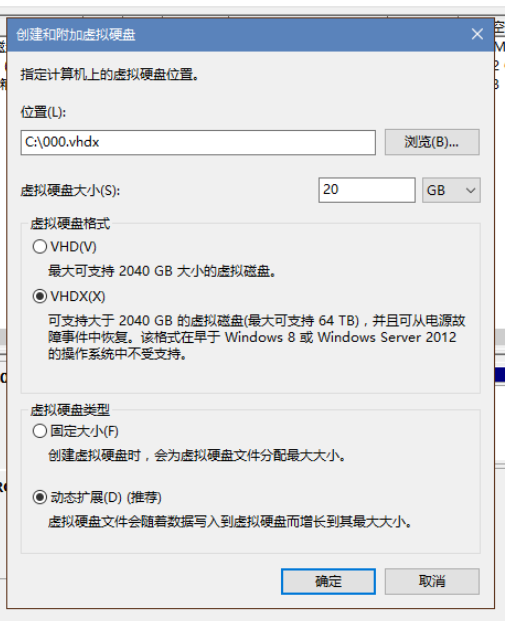 - 笔者创建了一个20GB的vhdx格式虚拟磁盘000.vhdx,vhdx文件放在了C盘根目录里面