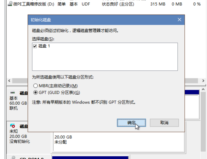 - 右键新产生的磁盘,点击 初始化磁盘,使用GPT分区表,确定即可