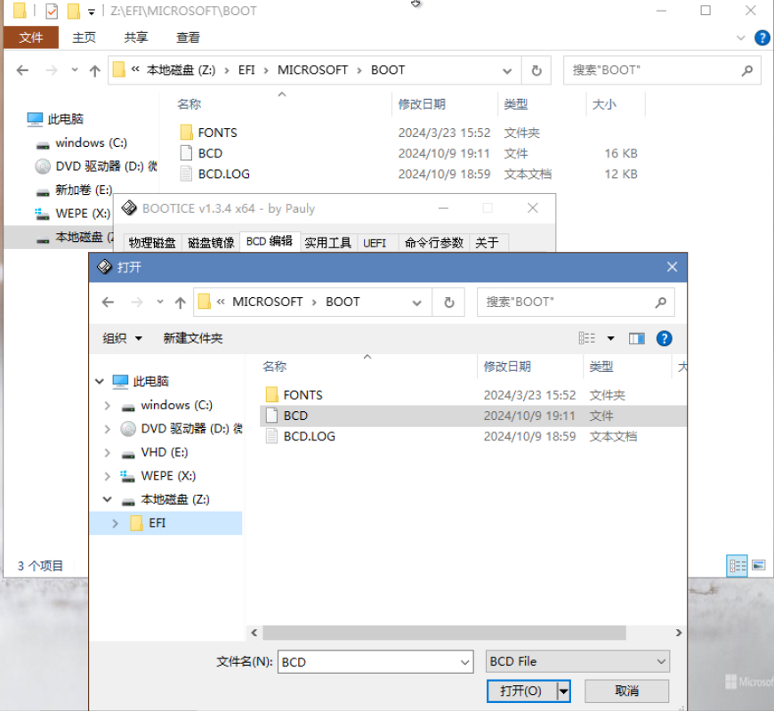 使用DiskGenius等软件挂载EFI分区.把微PE的ISO里面的EFI文件夹复制到EFI分区里面.打开Bootice小工具,选择BCD编辑,点击右侧的三个点,选择EFI分区里刚刚复制的EFI文件夹里面的BCD文件,具体路径为: