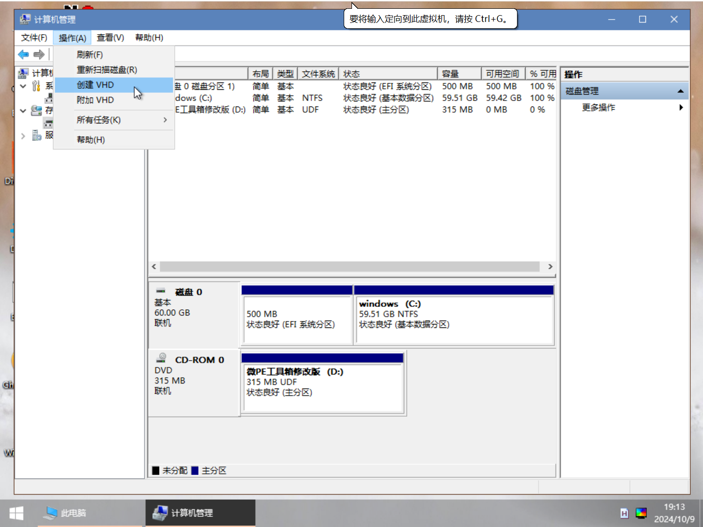 - 选中一个磁盘,点击左上角 操作 ,创建VHD