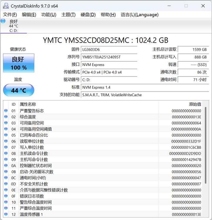 主要检查硬盘的一些信息,硬盘健康状态信息检测工具,可准确检测HDD机械硬盘和SSD固态硬盘的健康状态及各项参数,例如温度、固件版本、序列号、接口类型、通电时间和次数等。