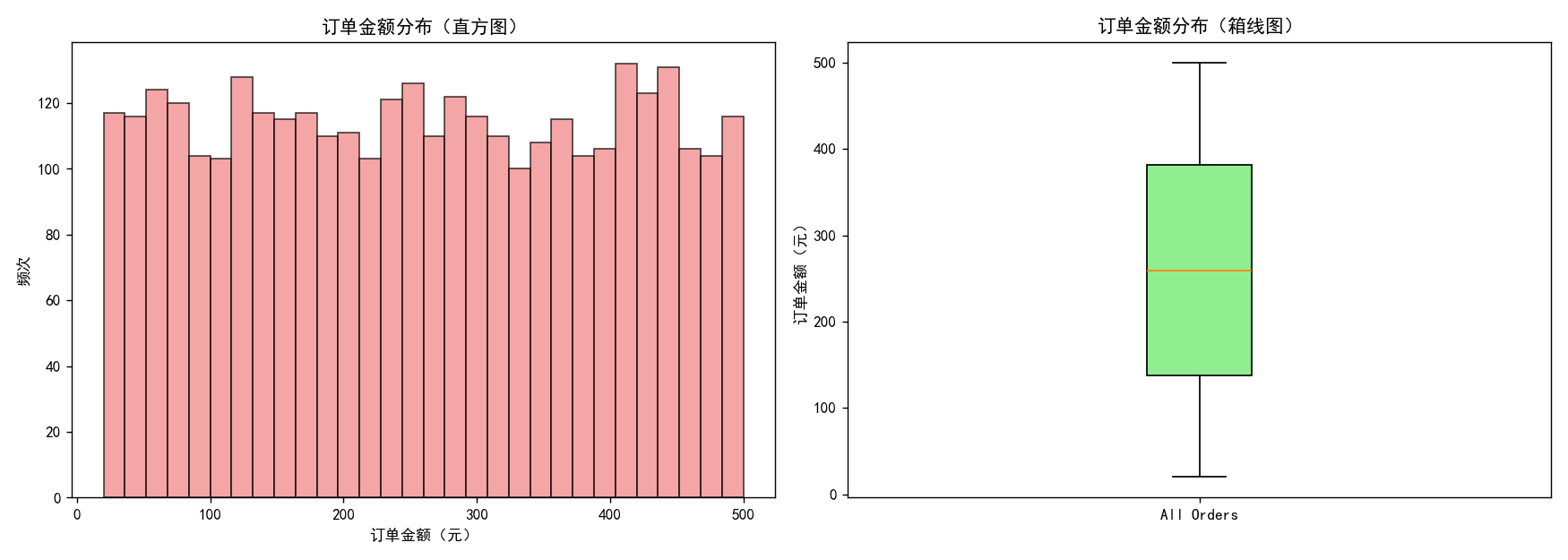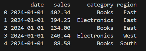 regions = ['North', 'South', 'East', 'West']for date in dates:for _ in range(np.random.randint(5, 15)): # 每天随机订单数data.append({'date': date,'sales': np.round(np.random.uniform(20, 500), 2),'category': np.random.choice(categories),'region': np.random.choice(regions)})df = pd.DataFrame(data)