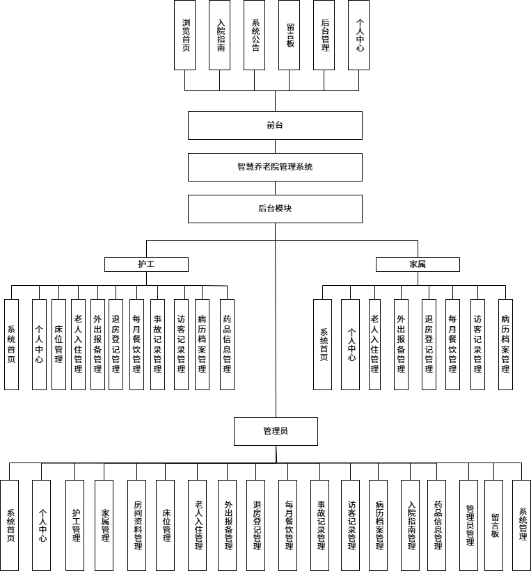平台主要面向系统管理员、家属代表、护理人员这三类核心群体,给他们提供不同的功能模块。其核心管理功能包含基础信息维护、家属与护工人事管理、长者进出院登记、意外事件记录、就诊档案管理、药品信息维护、探访管理等诸多业务模块。