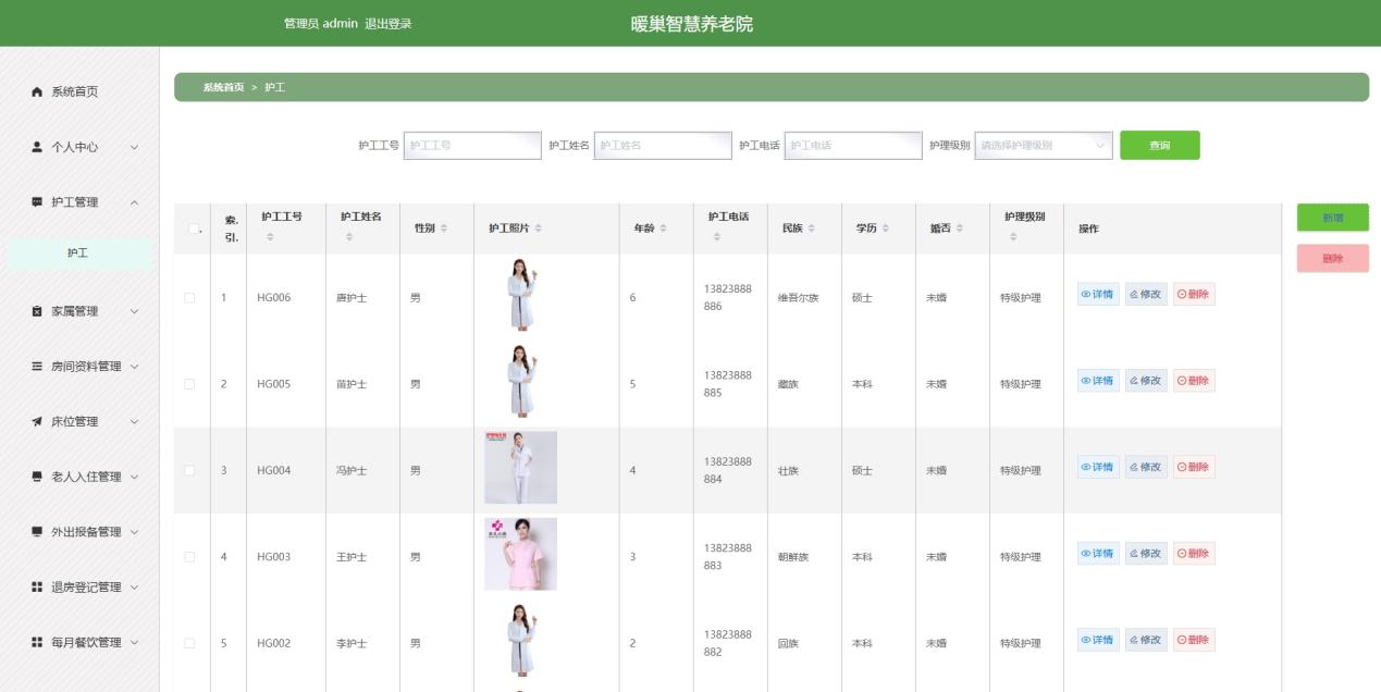 护工可以看到系统首页,个人中心,床位管理,老人入住管理,外出报备管理,退房登记管理,每月餐饮管理,事故记录管理,访客记录管理,病历档案管理,药品信息管理界面进行操作。