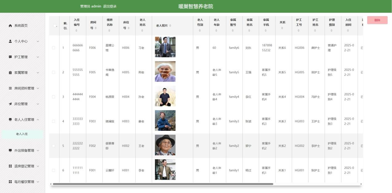 管理员可以看到系统首页,个人中心,护工管理,家属管理,房间资料管理,床位管理,老人入住管理,外出报备管理,退房登记管理,每月餐饮管理,事故记录管理,访客记录管理,病历档案管理,入院指南管理,药品信息管理,管理员管理,留言板和系统管理界面进行操作。