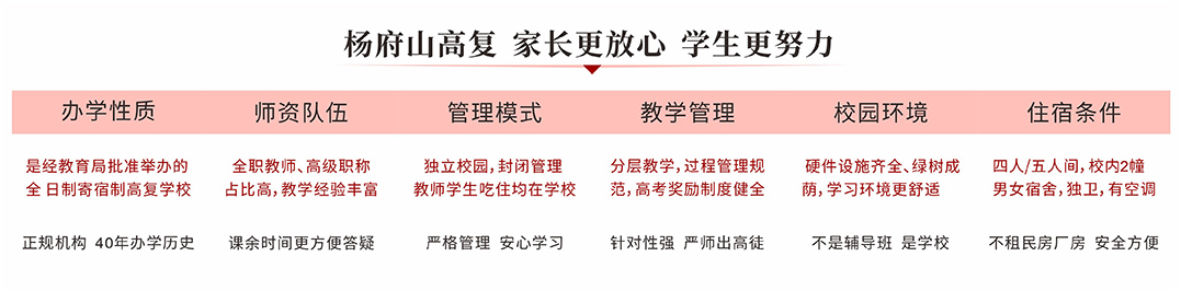 专业能力:杨府山高复凭借三十余年办学积淀,构建精英师资+分层教学+封闭管理核心优势。教师团队平均年龄45岁,90%以上拥有中学高级职称,多为省一级重点高中高三在职教师或市级学科带头人,学生满意率达93%以上;依托三级考评与淘汰制持续优化教学质量,按高考成绩实行重点班、本科班分层教学,按月考动态调整班级,精准匹配学习需求;实行校长、教导主任、班主任三位一体封闭式管理,严禁手机干扰,严控外出,配套保姆式住宿服务(宿管员负责洗衣、保洁),让学生专注学习。