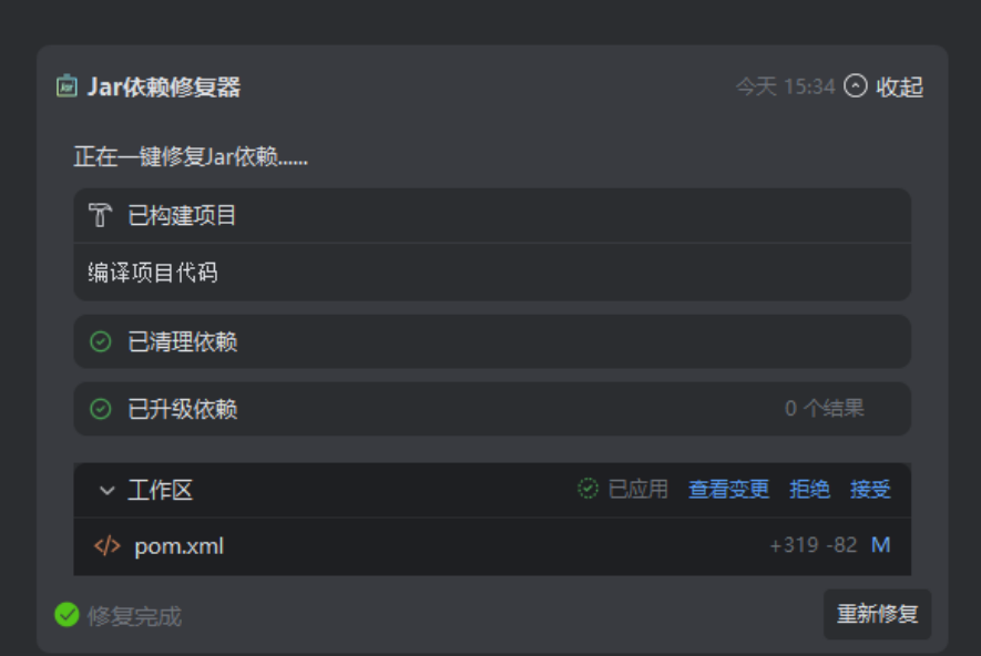 有人可能会问:IDEA不是已经有Maven Helper插件了吗?确实,Maven Helper能可视化依赖树、高亮冲突,但它只负责“看”,解决问题仍需手动操作。而飞算JavaAI的目标是从诊断到修复闭环:发现问题 → 分析原因 → 给出方案 → 生成代码。相当于把原本需要半小时的手动调试,压缩成一次点击。