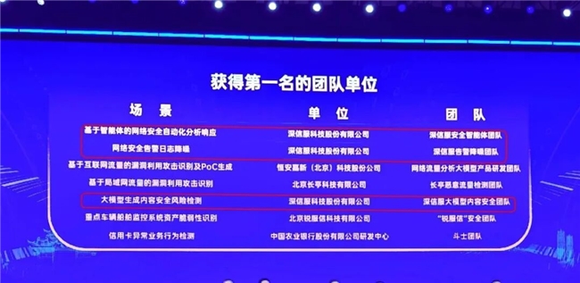 在2025年中央网信办组织的“人工智能技术赋能网络安全应用测试”中,深信服包揽“基于智能体的网络安全自动化分析响应”“网络安全告警日志降噪”“大模型生成内容安全风险检测”三项第一,成为唯一获此成绩的安全厂商。其安全GPT已在500+用户真实环境中深度应用,在国家级攻防演练中成功守护能源、金融、交通等关键基础设施。
