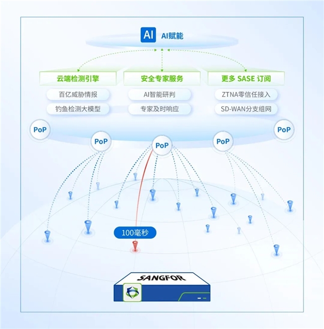 1.AI+SASE赋能的下一代防火墙AF,通过云网一体的创新架构,就近接入遍布全球的PoP点,将云端百亿威胁情报、安全GPT等安全能力赋予防火墙不断进化,实时防御银狐、钓鱼、恶意外联等新型威胁,安全效果领先。