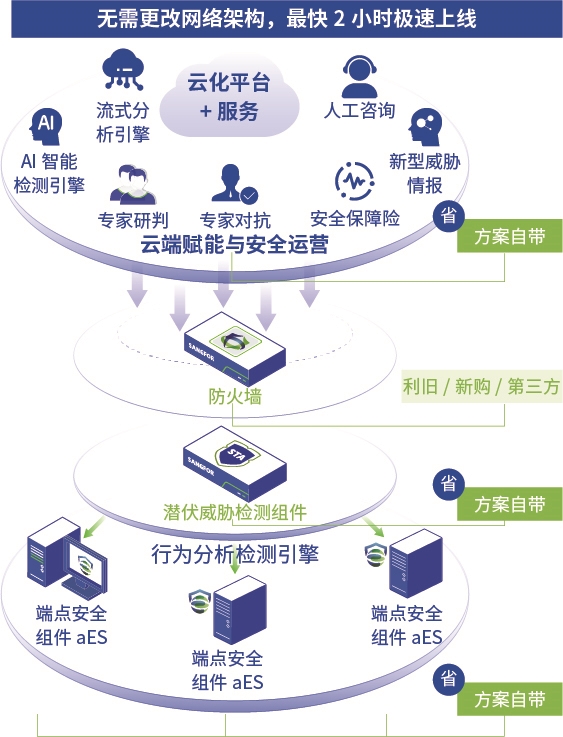 深信服创新提出“AI内核、云化赋能”的安全新范式2.0,通过“线下硬件+线上订阅”的联动部署方式,实现安全能力按需扩展。