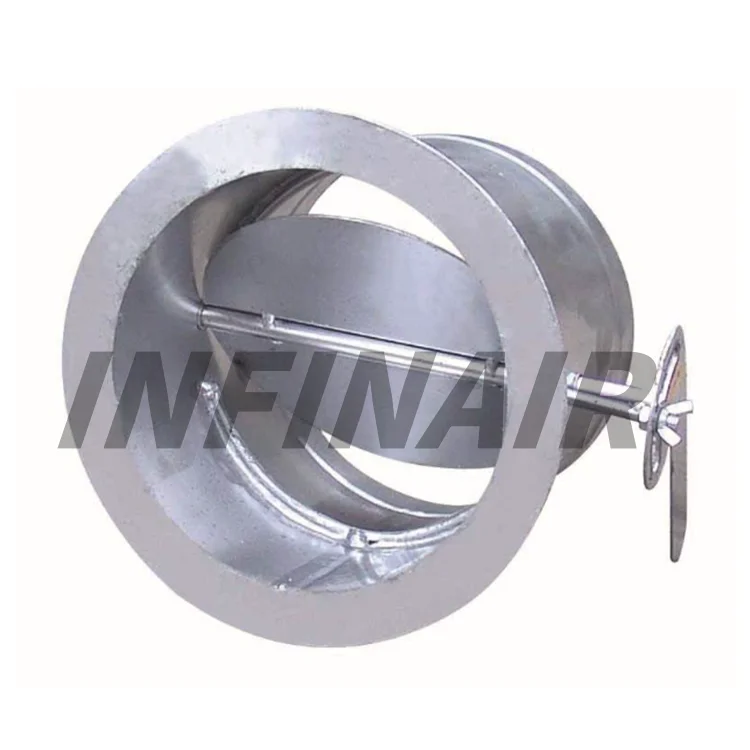 英飞圆形蝶阀 PDF:采用镀锌钢板,手动、电动的控制方式,应用:安装在有通风要求的通风系统的风管上作风量调节,控制风速之用。