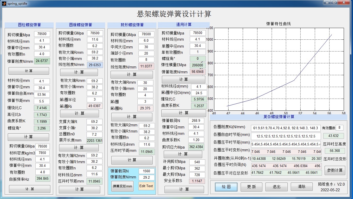 它还能进行螺旋弹簧,多片簧,少片簧,稳定杆,减震器的匹配计算。以螺旋弹簧为例,在Matlab里可以构建函数来模拟螺旋弹簧的特性。