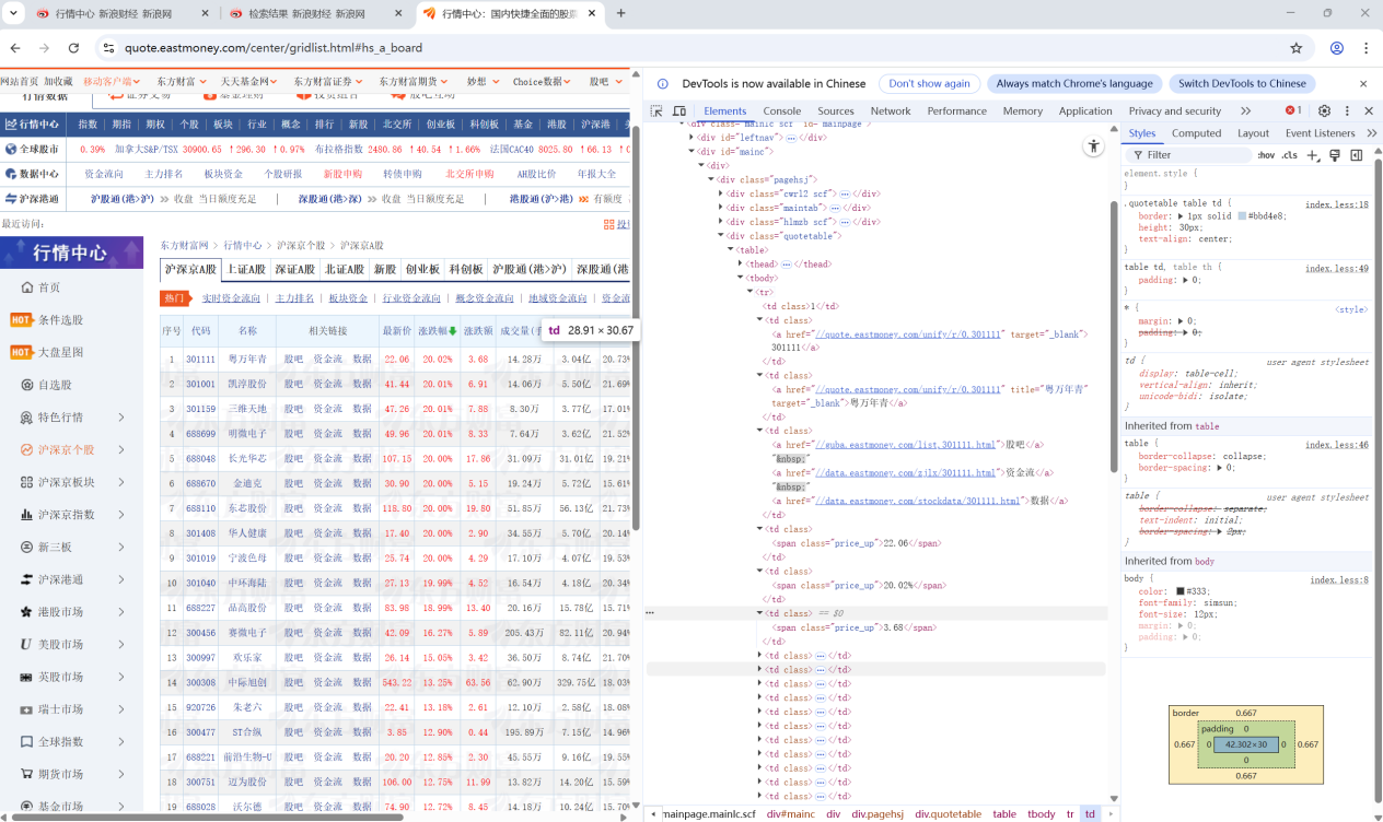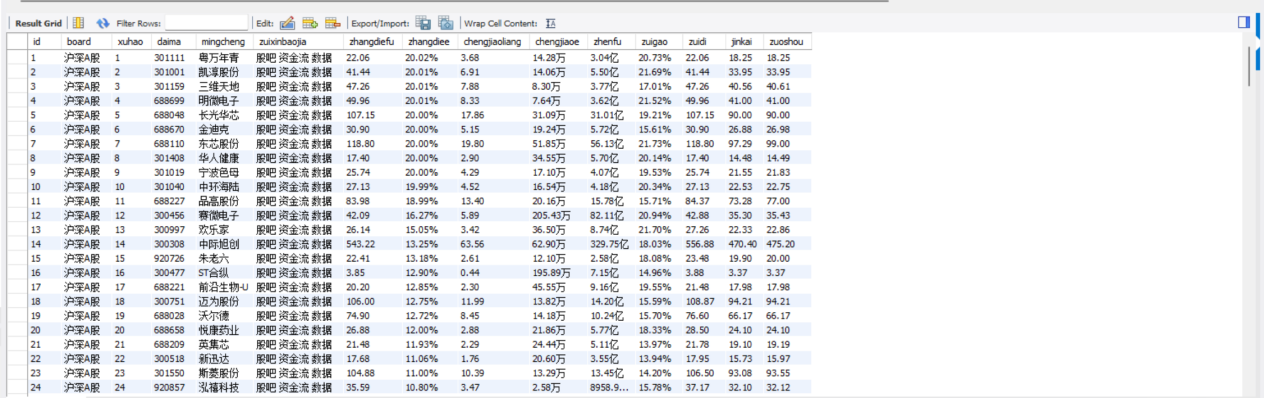 if __name__ == "__main__":opt = Options()# opt.add_argument("--headless") # 如果需要无头浏览器可打开driver = webdriver.Chrome(options=opt)boards = {"沪深A股": "https://quote.eastmoney.com/center/gridlist.html#hs_a_board","上证A股": "https://quote.eastmoney.com/center/gridlist.html#sh_a_board","深证A股": "https://quote.eastmoney.com/center/gridlist.html#sz_a_board",}for name, url in boards.items():crawl_board(name, url, max_pages=2)driver.quit()cursor.close()db.close()print("\n全部板块前 2 页爬取完成!")